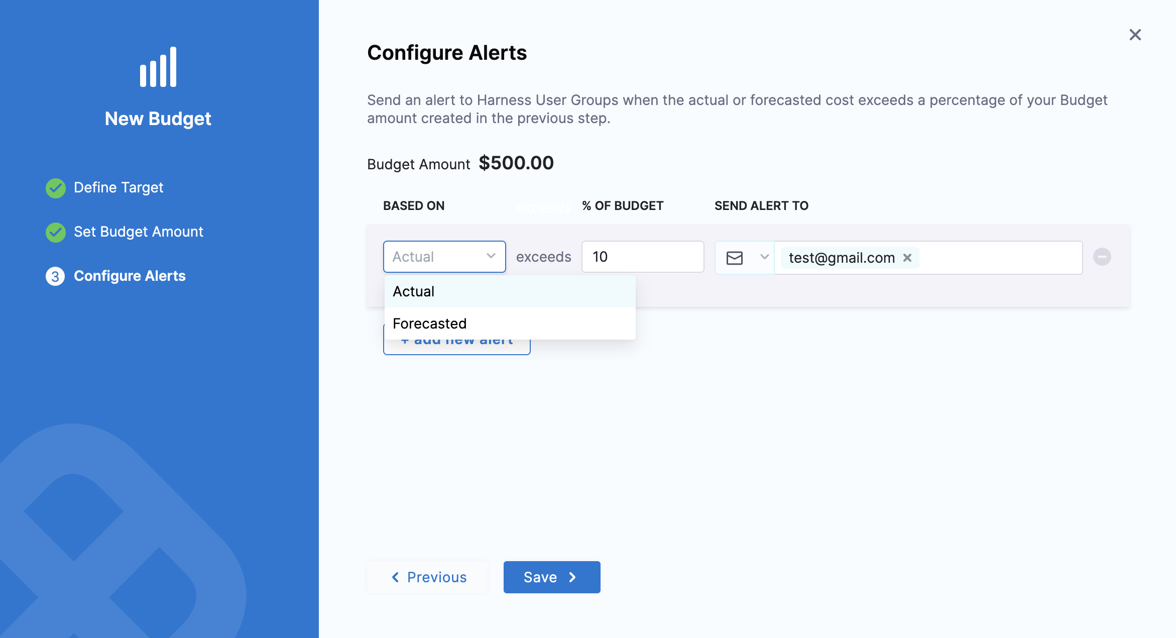 • Specify the Percentage of Budget based on the Actual Cost or Forecasted Cost. Harness sends alerts when the Actual Cost or Forecasted Cost exceeds the threshold.