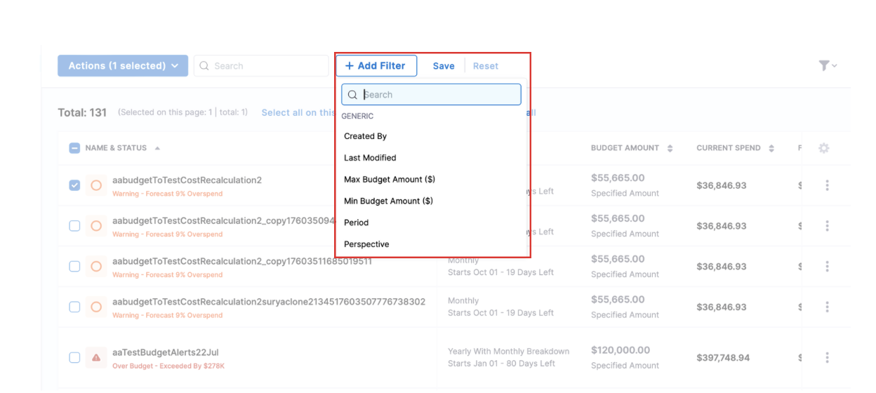 • Customizable View: Configure your columns to display the metrics that matter most: Time Period, Budget Amount, Current Spend, Forecast, Forecast vs. Budget, Current Spend vs. Budget, Thresholds, Created By, Last Modified