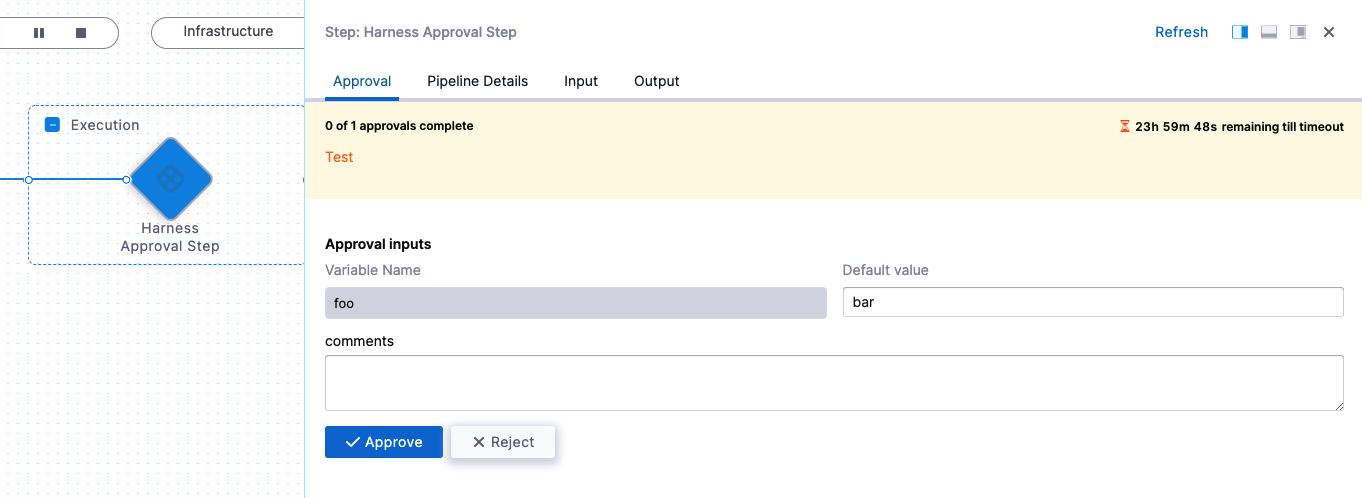 An approver can approve or reject the step, stopping the pipeline. The approver can also add comments and define variables for use by subsequent approvers and steps.