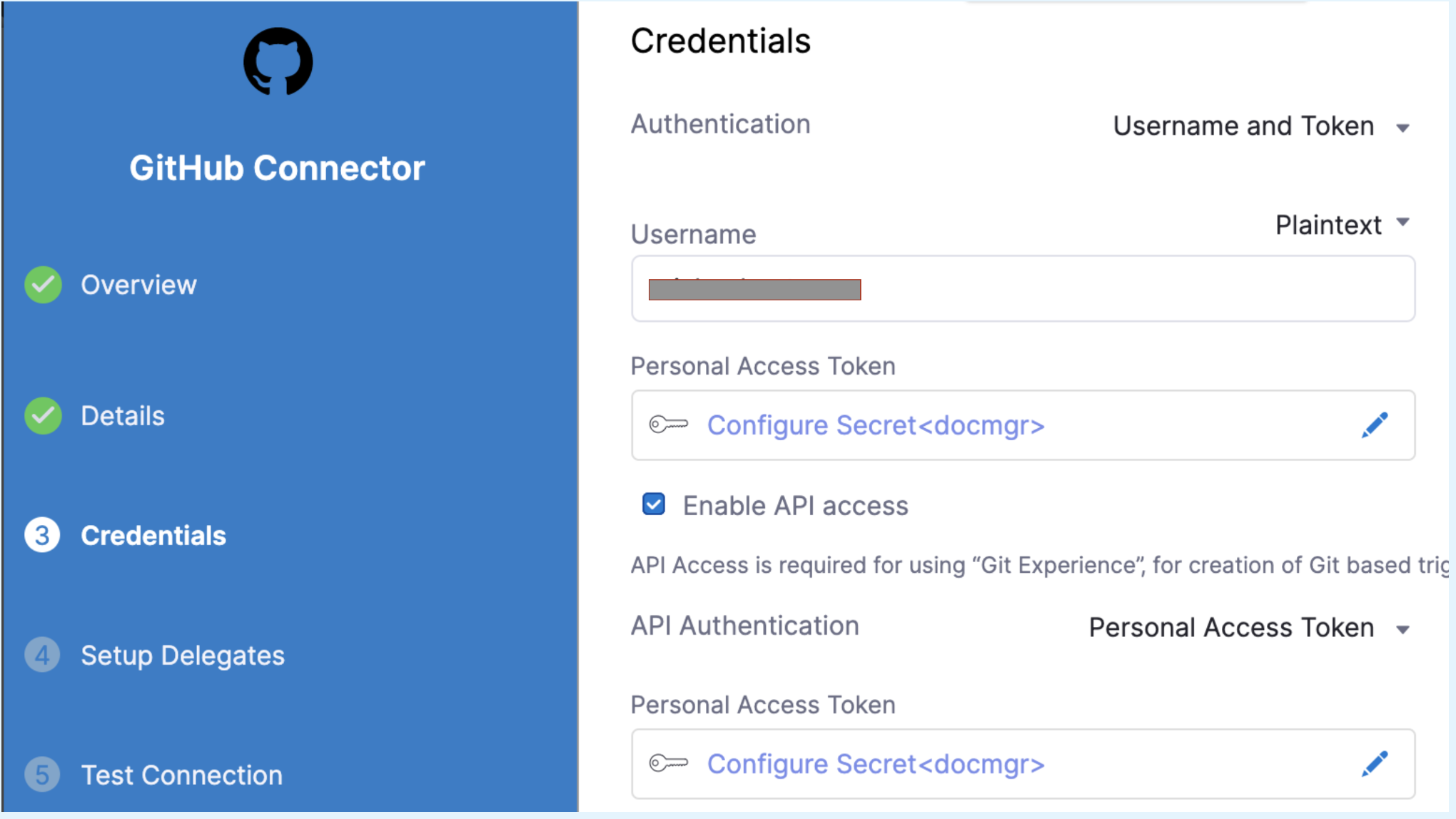 Connector must use the Enable API access option and token. The connector must use the Enable API access option and Username and Token authentication. ​Harness requires the token for API access. Generate the token in your account on the Git provider and add it to Harness as a Secret. Next, use the token in the credentials for the Git Connector.​​