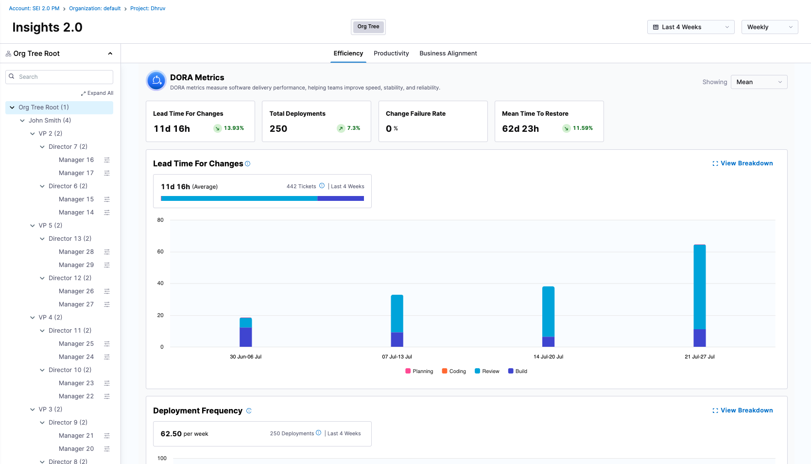 Using this structure, SEI 2.0 automatically builds a manager and reportee tree, allowing you to view and analyze metrics in the context of real-world teams and reporting lines.